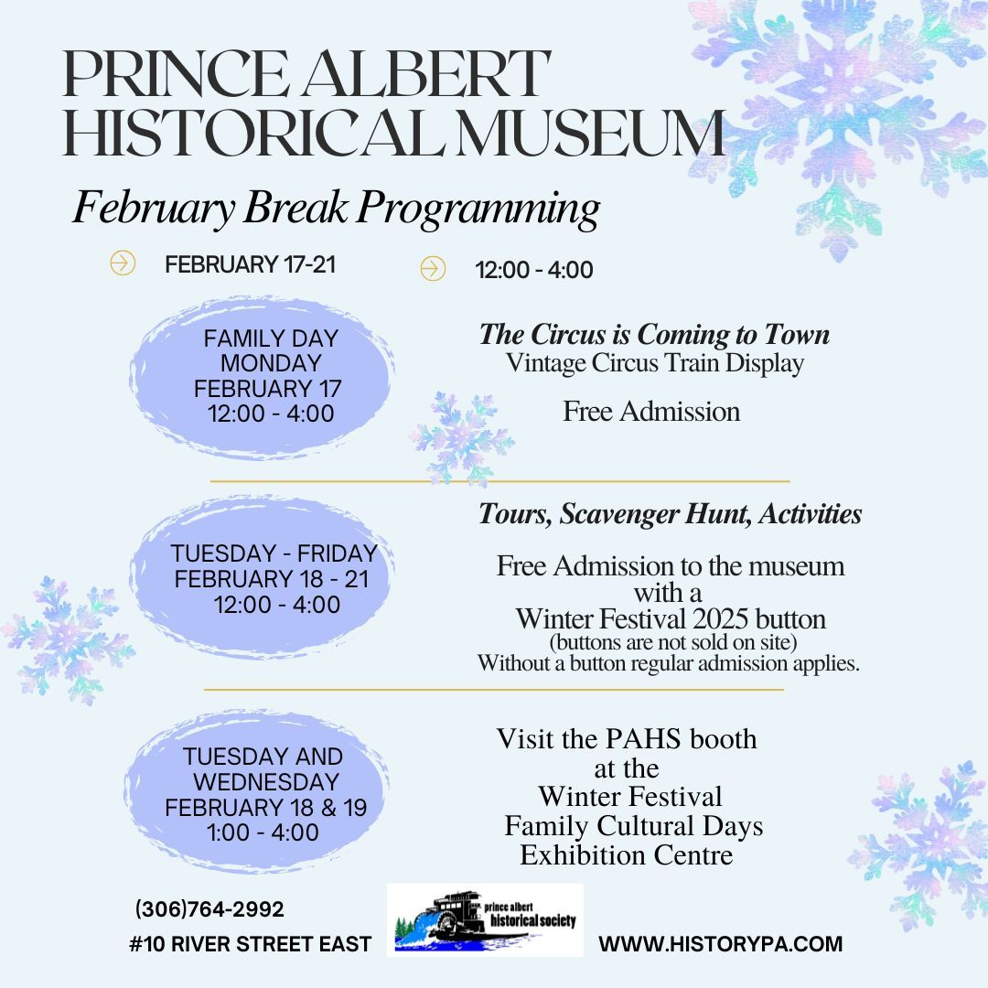 Join us at the Prince Albert Historical Museum, February 18-21, 12:00 - 4:00 for a scavenger hunt, self-guided tours, activities and games.